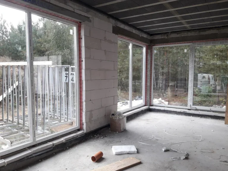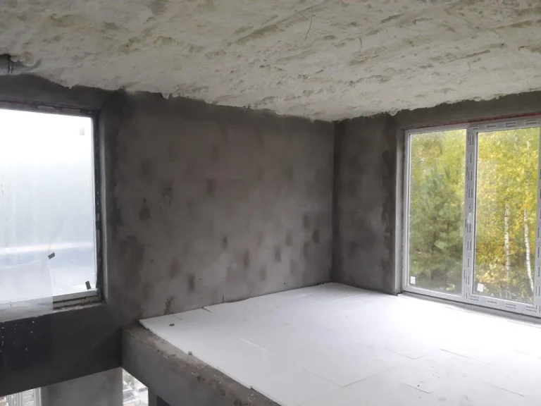 In the building, electrical, telecommunications (TV, Internet, telephone), plumbing and heating (electric heating with a boiler for domestic hot water) installations were routed. Interior plastering was done by spraying with a plastering unit. Thermal insulation made of EPS 80 polystyrene foam was installed under the floorboards. The facade was created using silicone exterior plaster .