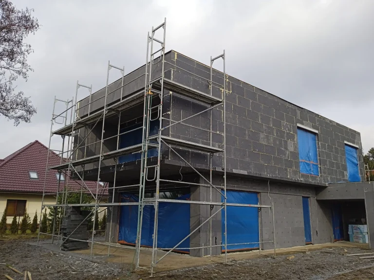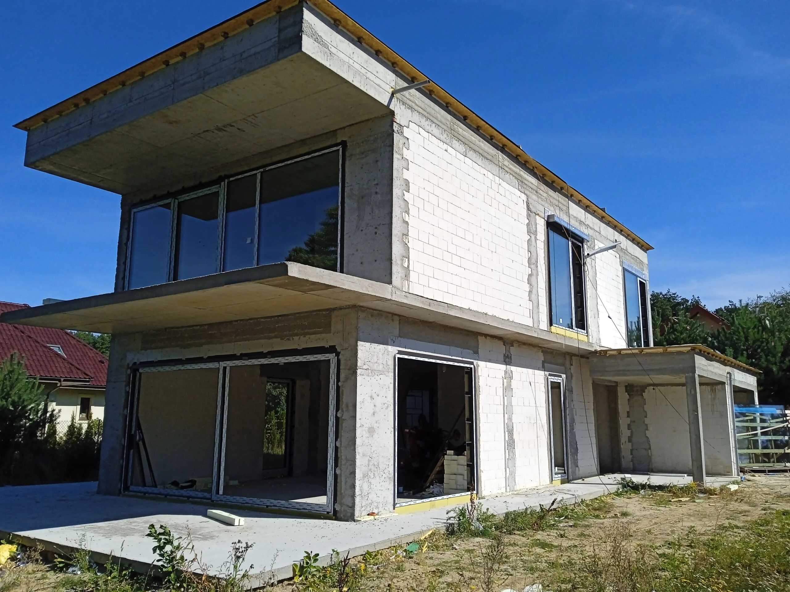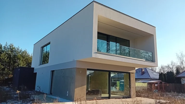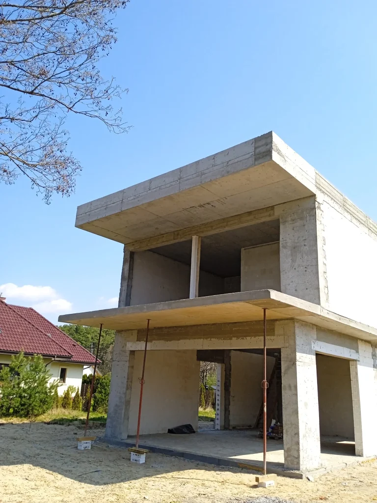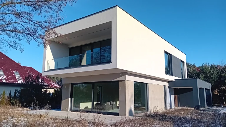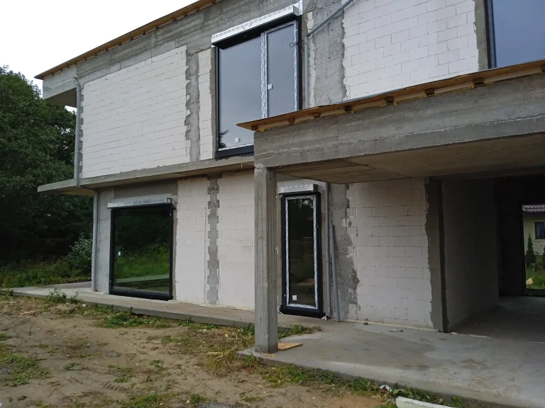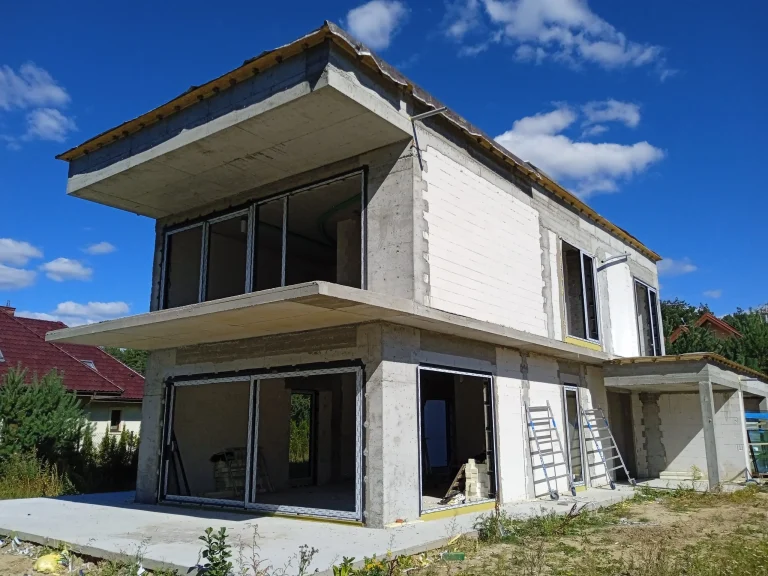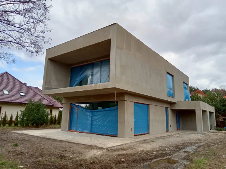 The 221 m2 house was erected on a reinforced foundation slab along with 15cm thick thermal insulation. Bearing and partition walls were made of silicate blocks with a thickness of 25cm and 12cm respectively. Monolithic ceiling. The roof of the building is flat.