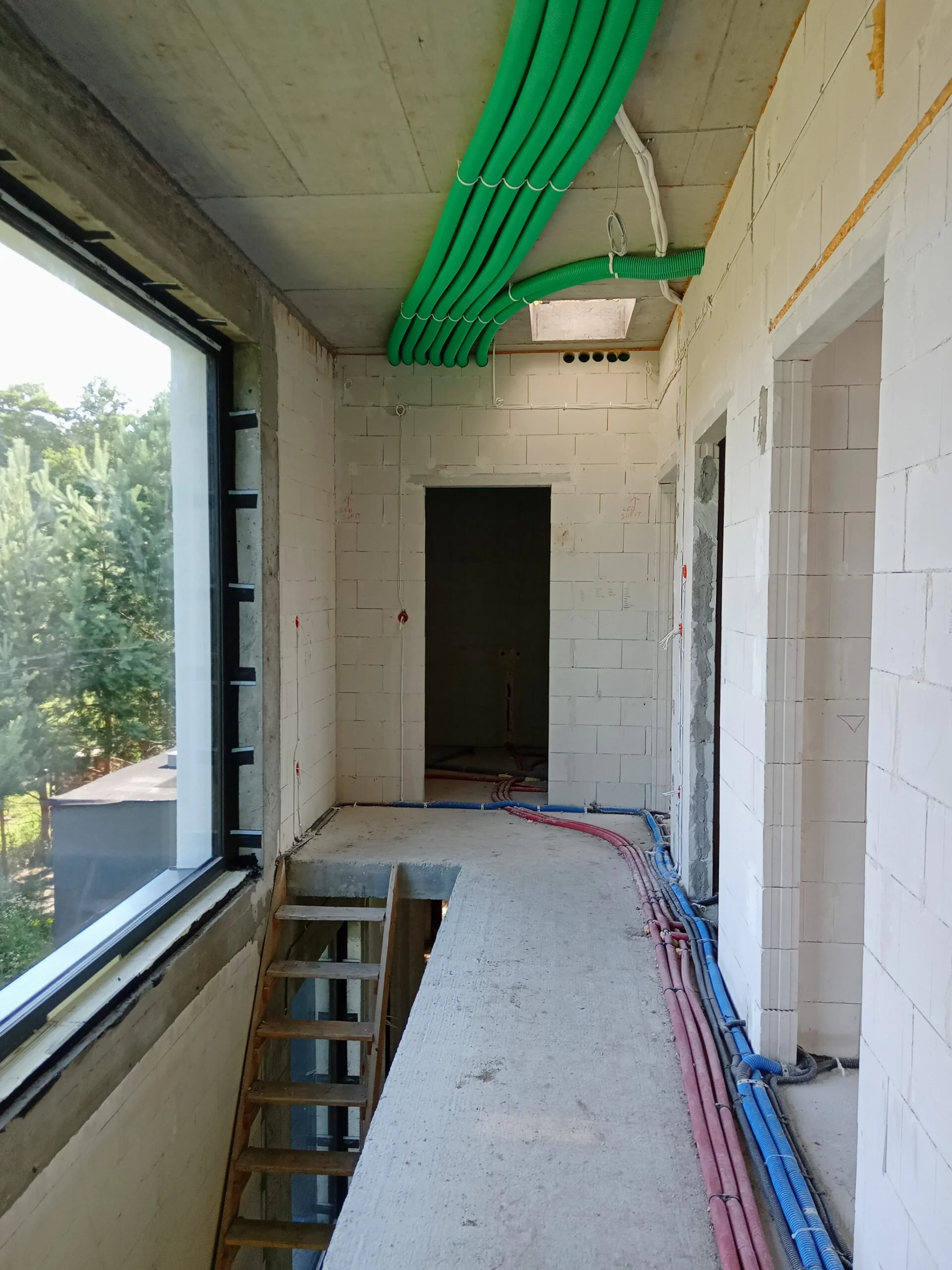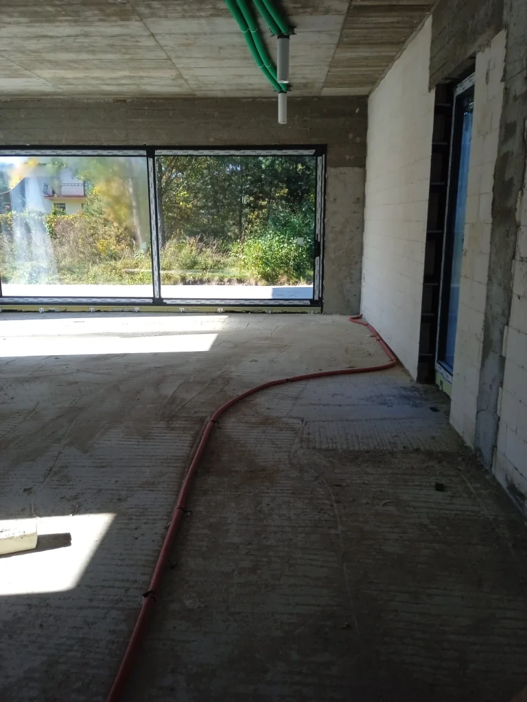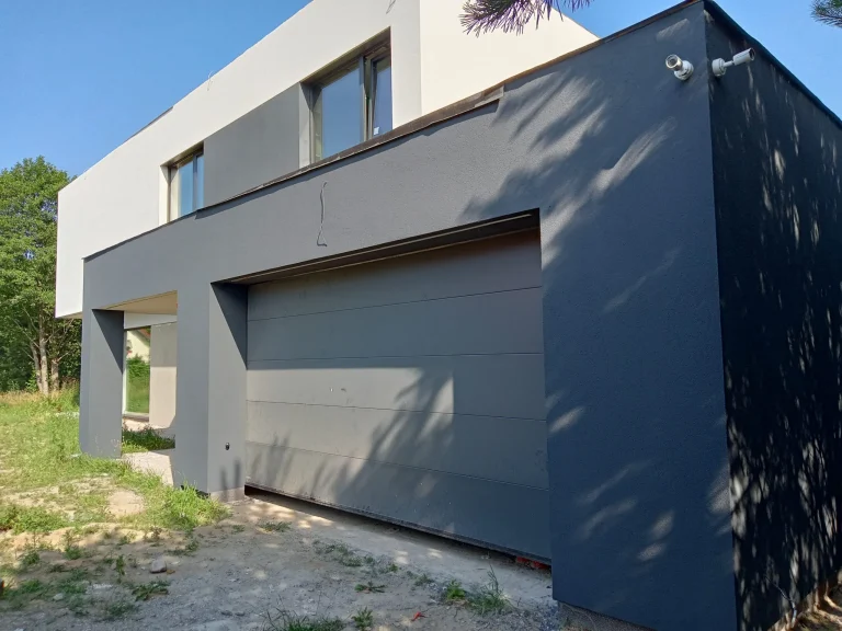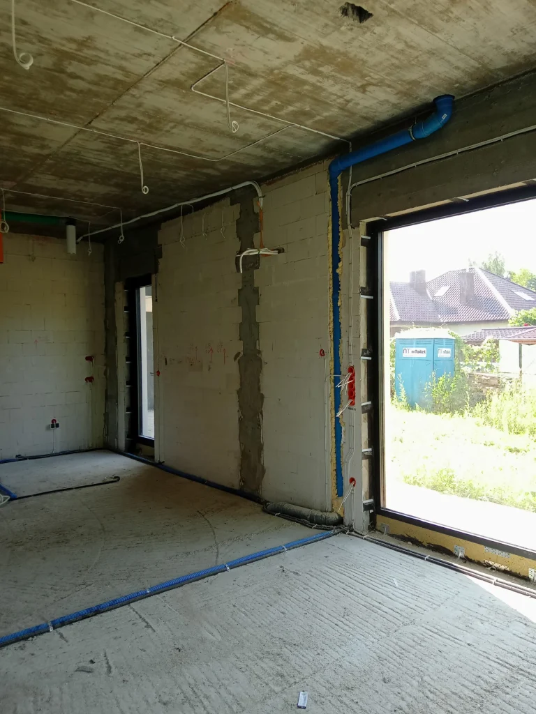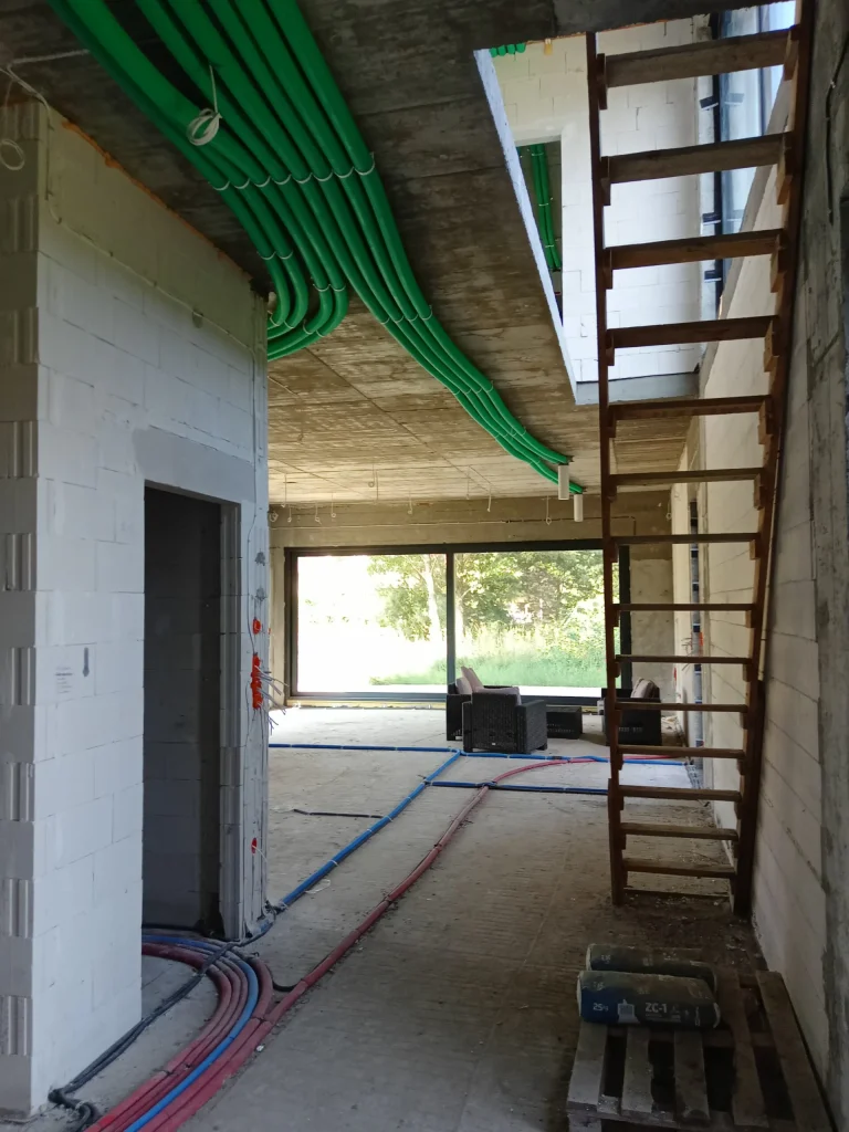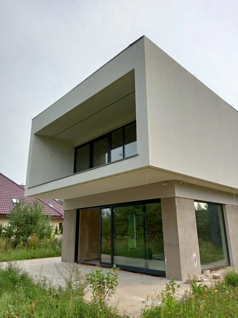 In the building, the installation of electric flush-mounted roller shutters with a drive and the warm installation of windows with the use of vapor-proof tapes, warm sills made of XPS and clinarite foundations was carried out. The house was equipped with electrical, telecommunications, plumbing, recuperation and air heat pump installation. A conduit for photovoltaic installation, air-conditioning installation and monitoring was also made.