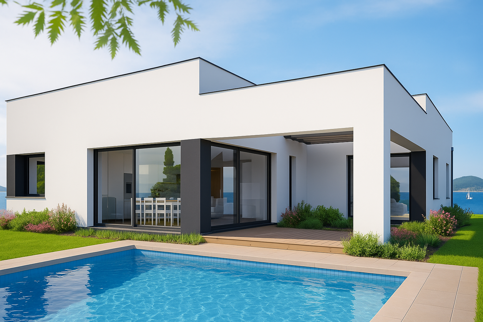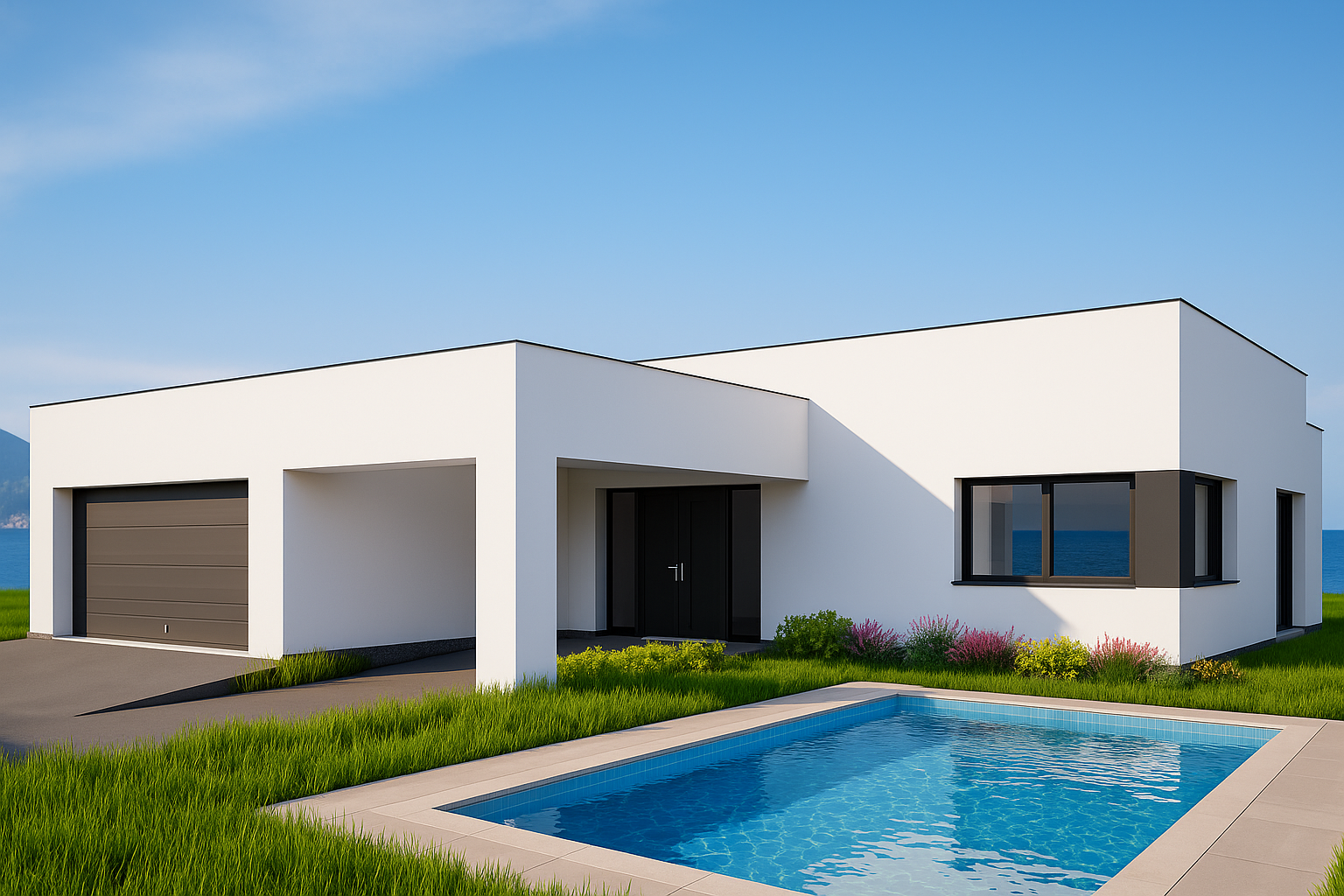 Sculpted in crisp white and charcoal, this minimalist flat‑roof villa offers pure modern geometry set against endless blue sea horizons.