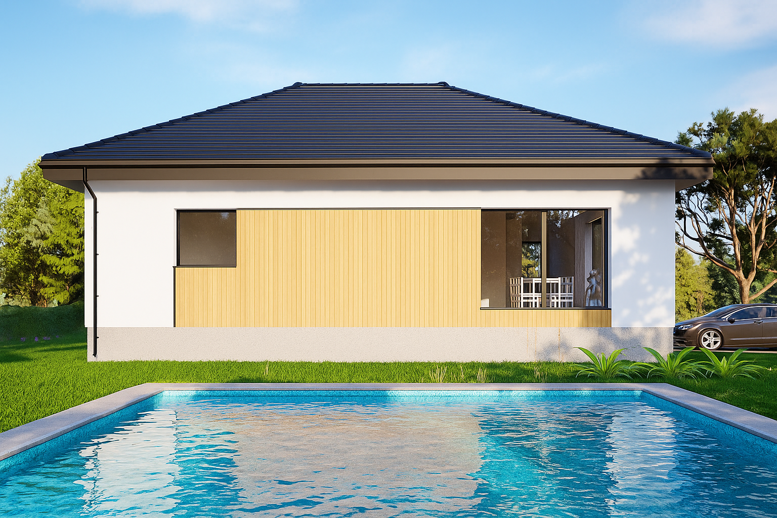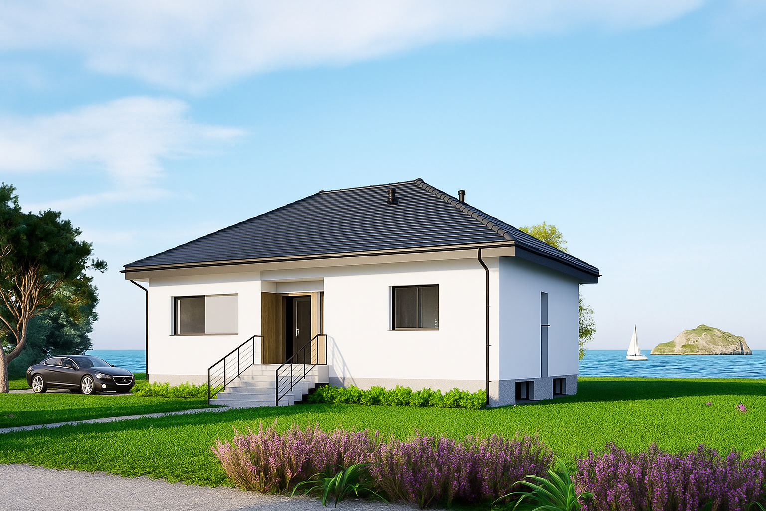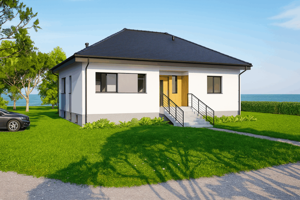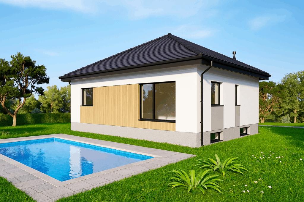 Nestled beside the sea, this modern single‑storey bungalow teams crisp white render with a charcoal hip roof and warm vertical timber cladding. Wide picture windows draw in coastal light, while a private pool and stone terrace extend the living space outdoors. The compact footprint, subtle grey accents and centrally placed timber entrance door create a clean, effortless aesthetic—perfect for relaxed seaside living.