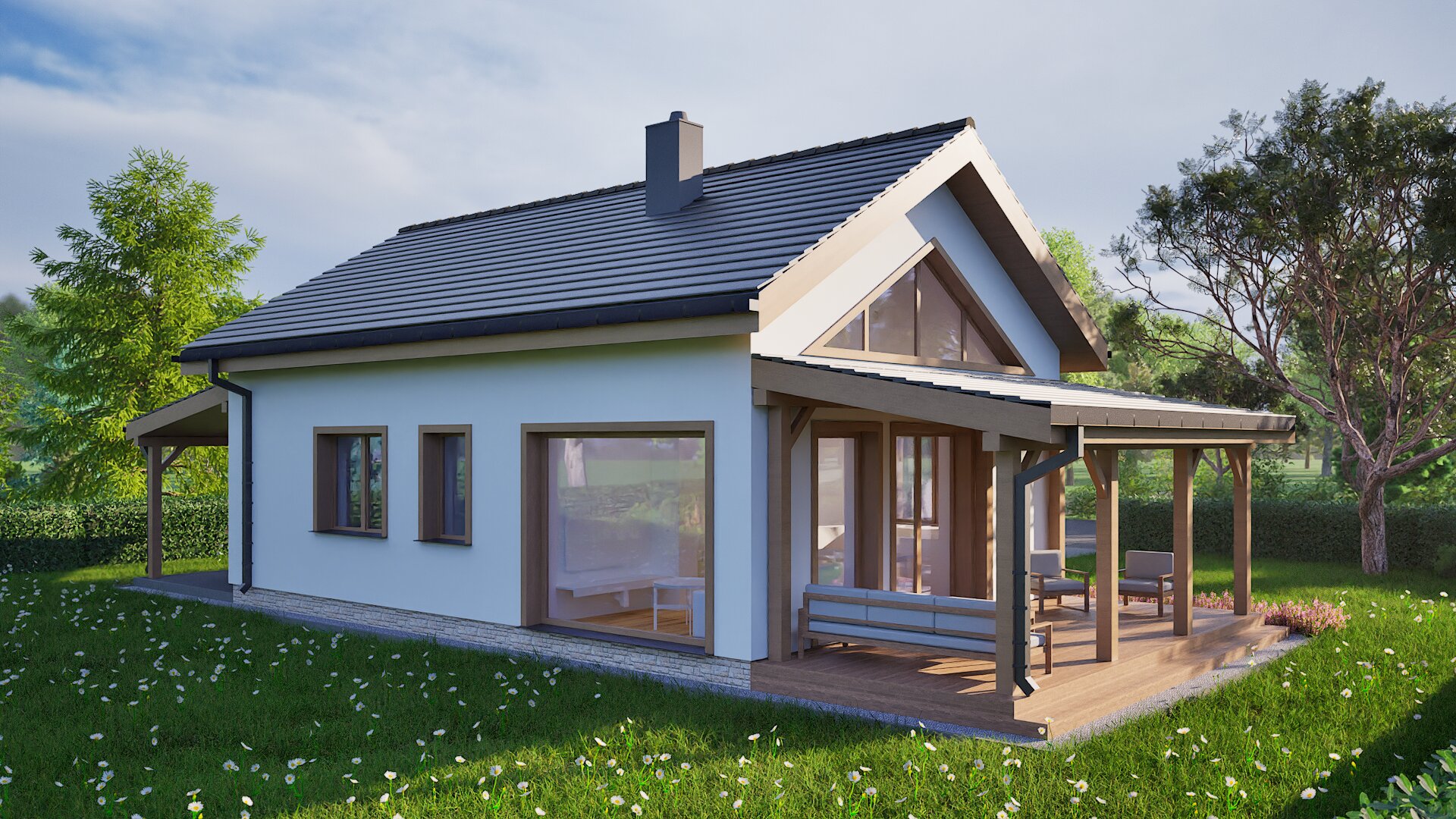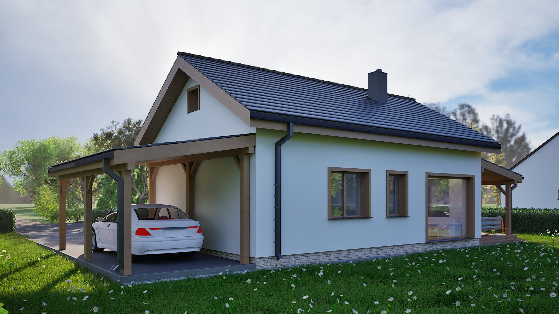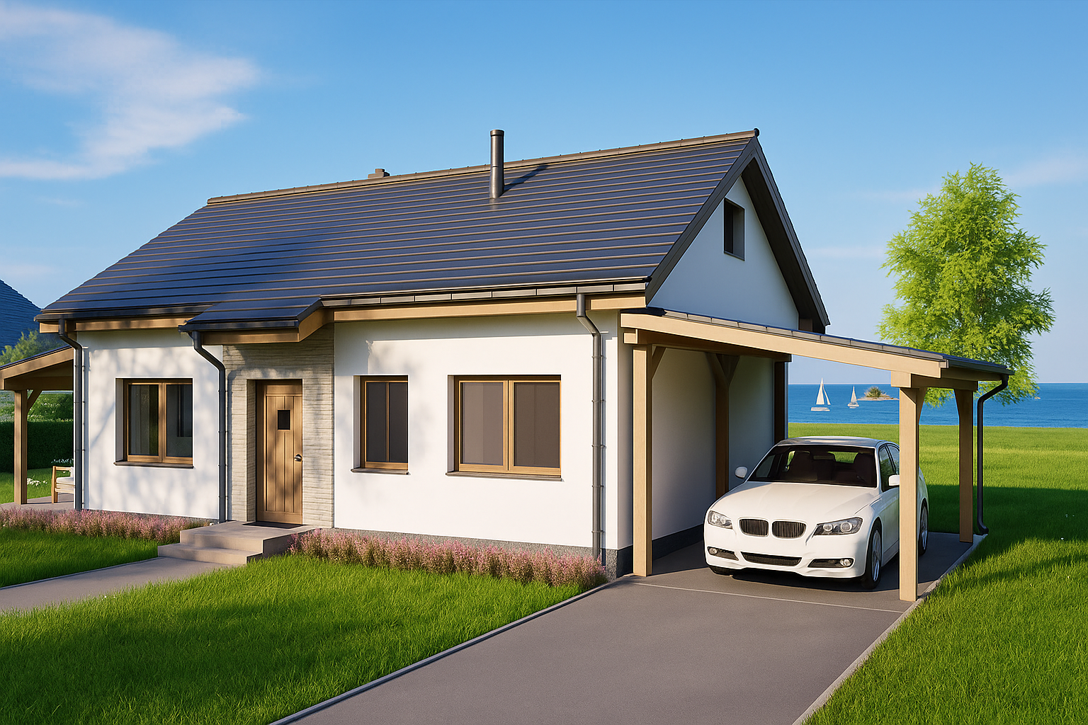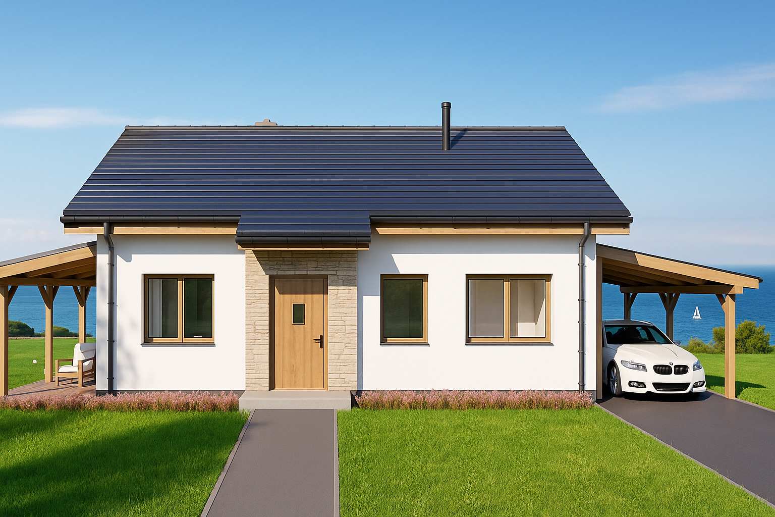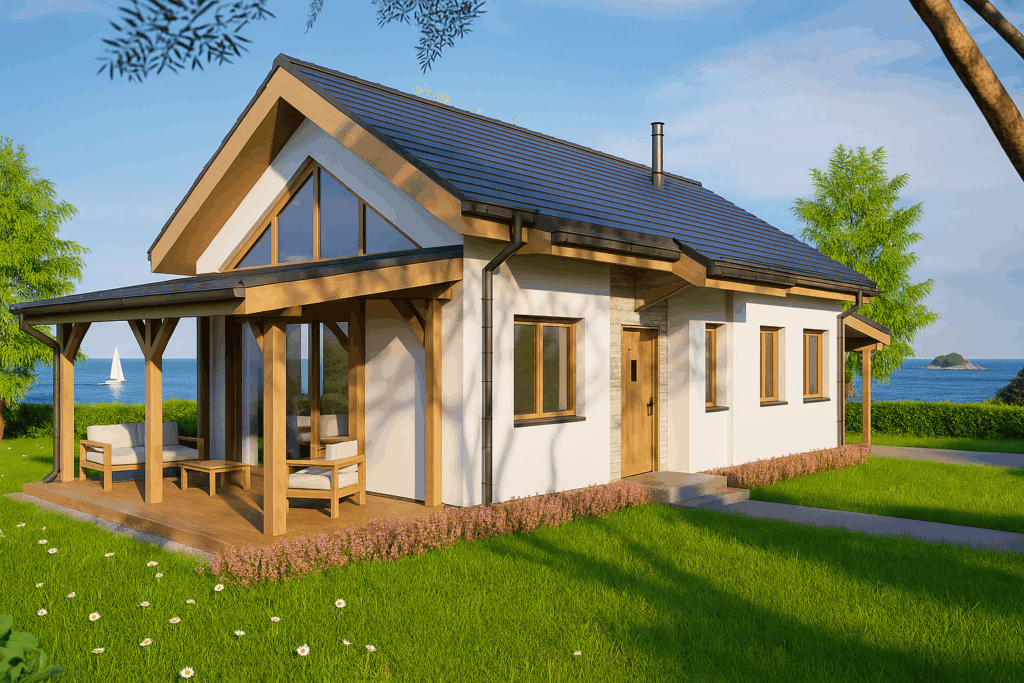 Designed for relaxed coastal living, this compact single‑storey cottage blends crisp white render with warm timber posts and window frames beneath a dark pitched roof. A generous wrap‑around veranda creates an outdoor lounge that flows directly from the light‑filled living area, framed by a soaring gabled window. An integrated timber carport extends from the roofline, providing sheltered parking without interrupting the clean silhouette. Stone detailing around the entrance adds subtle texture, while energy‑efficient construction and thoughtful orientation keep the home comfortable year‑round.