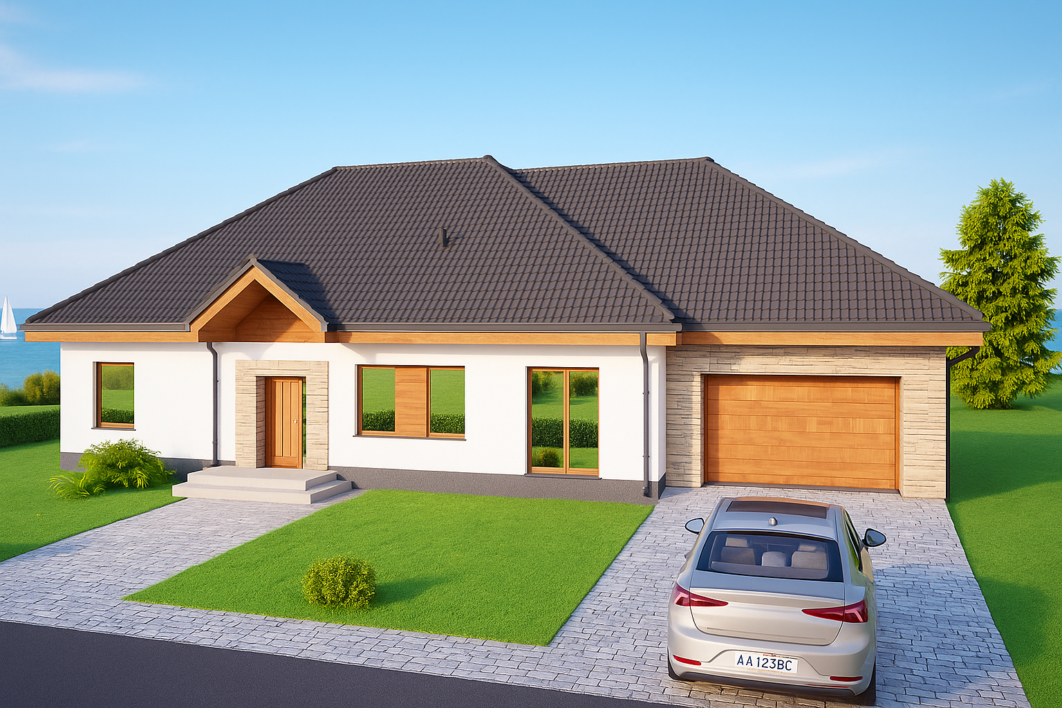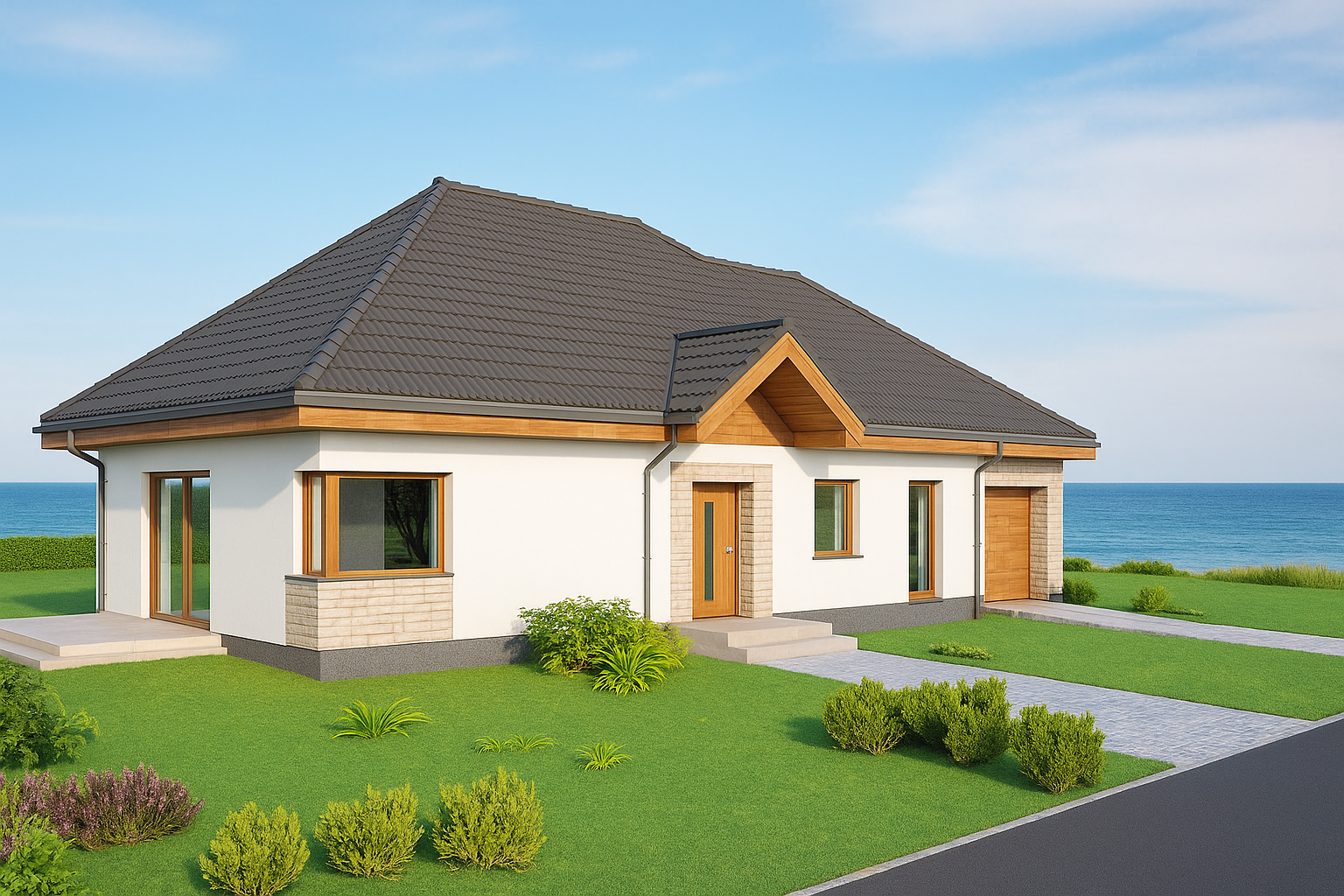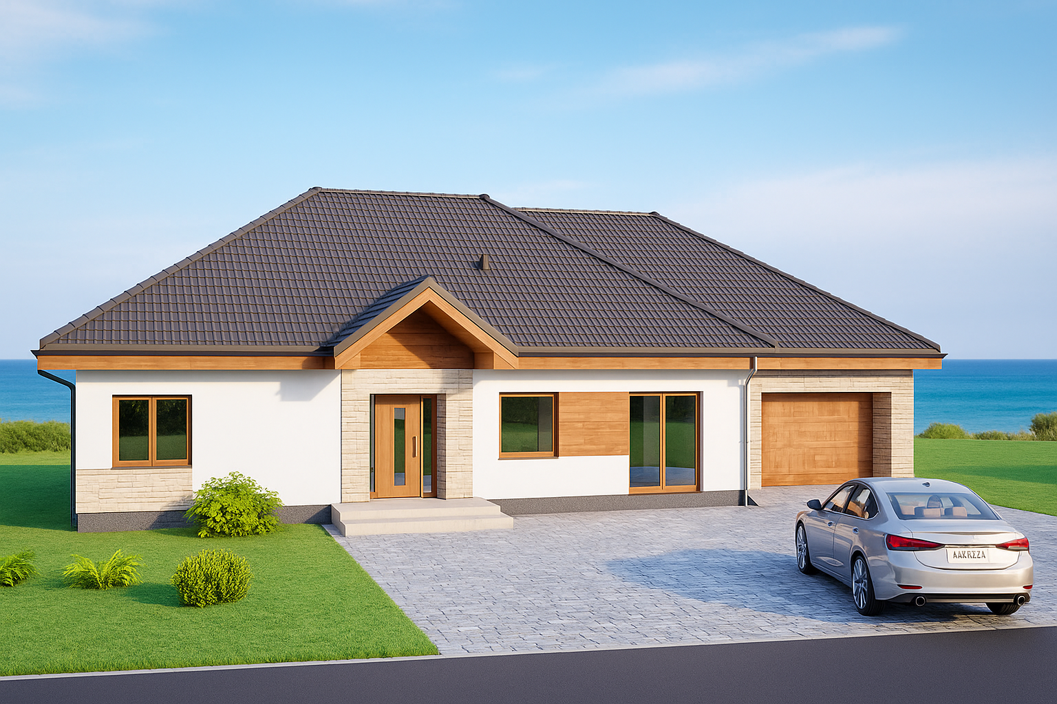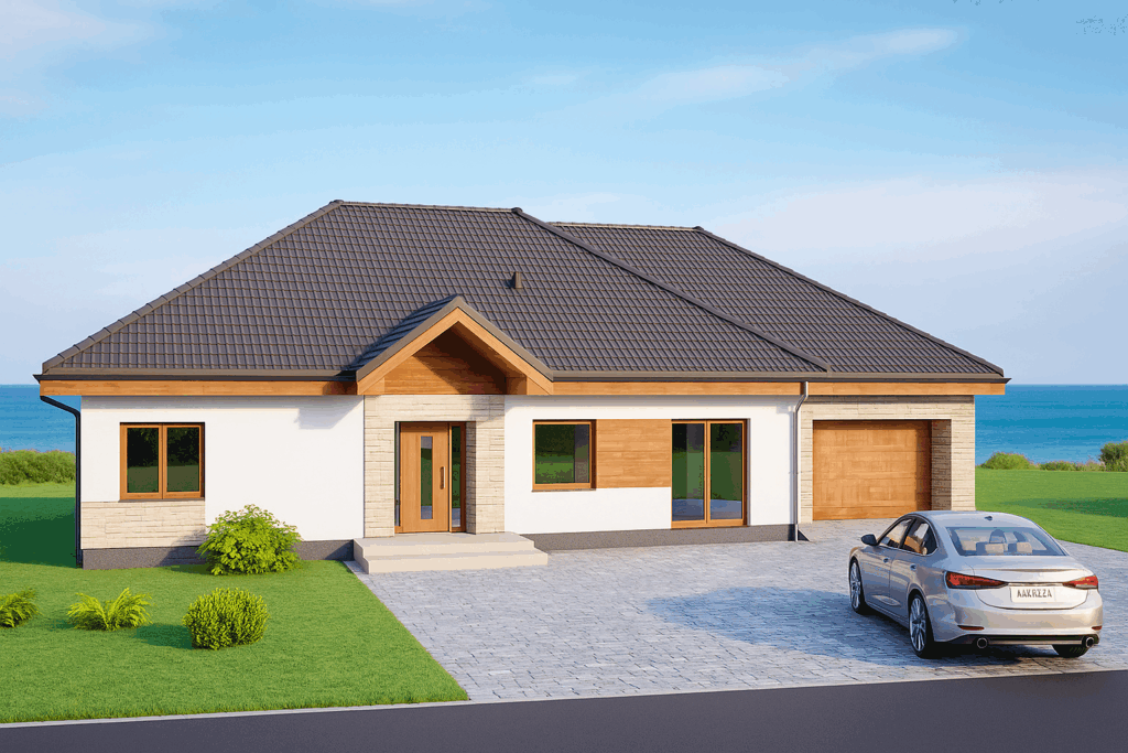 Overlooking the coastline, this single‑storey residence combines crisp white render with warm timber highlights and hand‑laid stone cladding beneath a dark tiled hip roof. Large picture windows and sliding glass doors flood the interior with light and open onto a broad stone terrace that wraps around the house. A welcoming gabled porch, integrated single garage and wide driveway ensure everyday convenience, while the sheltered veranda with a stone pillar invites outdoor dining in all seasons. Natural materials, energy‑efficient construction and timeless lines give this bungalow a relaxed yet refined character.