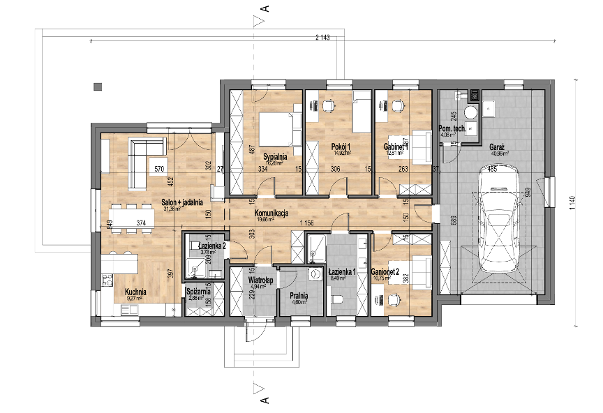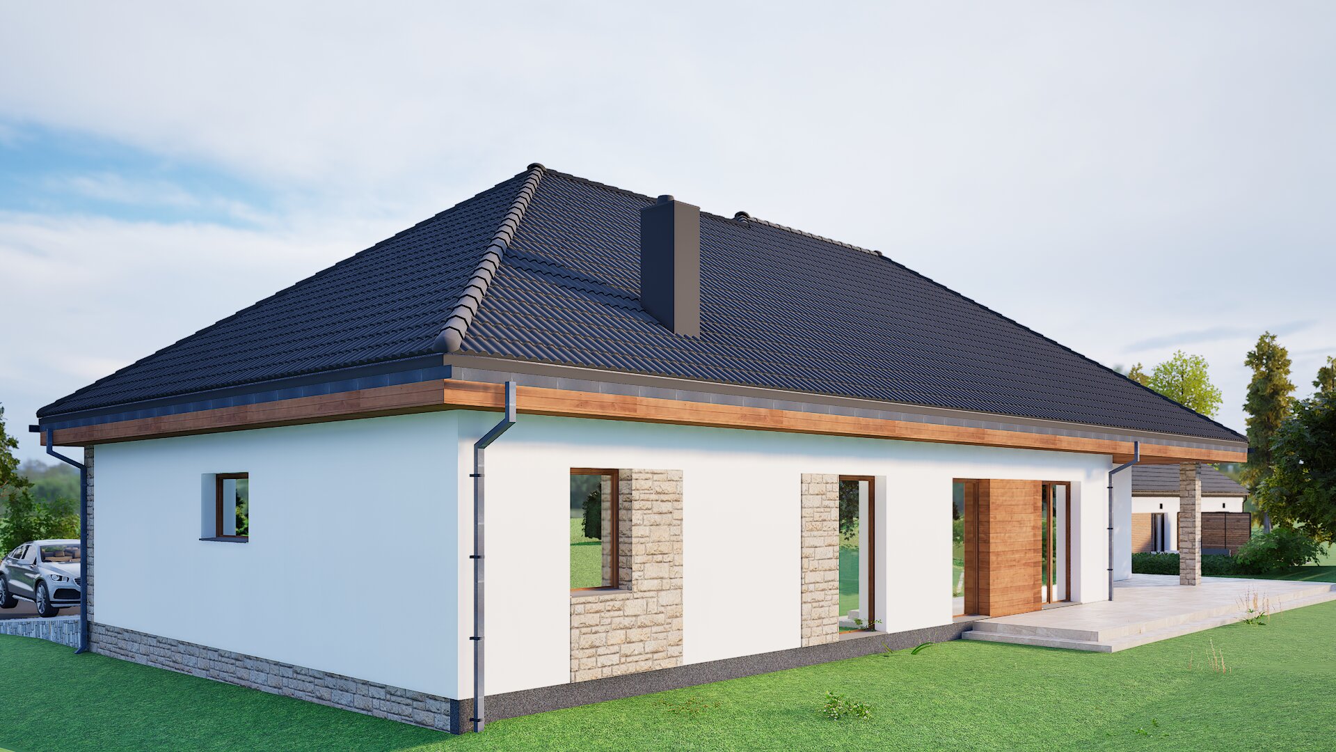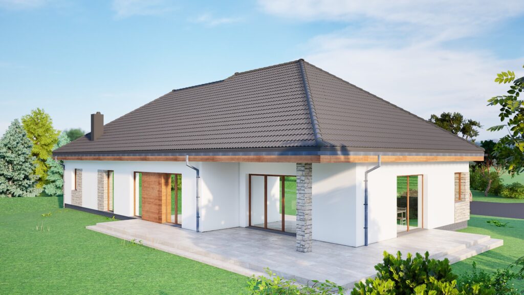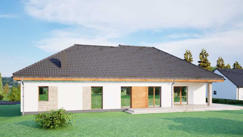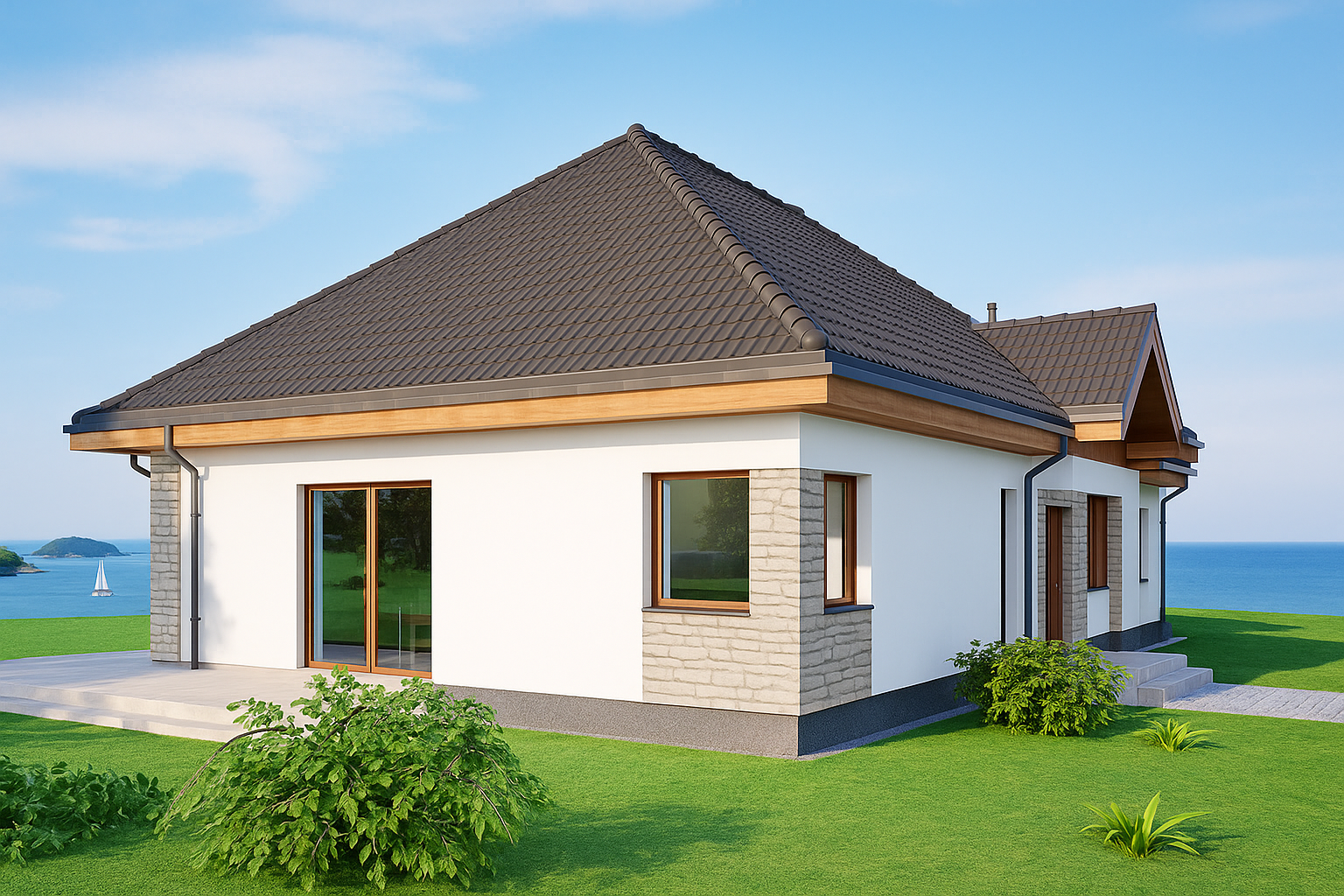 Overlooking the coastline, this single‑storey residence combines crisp white render with warm timber highlights and hand‑laid stone cladding beneath a dark tiled hip roof. Large picture windows and sliding glass doors flood the interior with light and open onto a broad stone terrace that wraps around the house. A welcoming gabled porch, integrated single garage and wide driveway ensure everyday convenience, while the sheltered veranda with a stone pillar invites outdoor dining in all seasons. Natural materials, energy‑efficient construction and timeless lines give this bungalow a relaxed yet refined character.