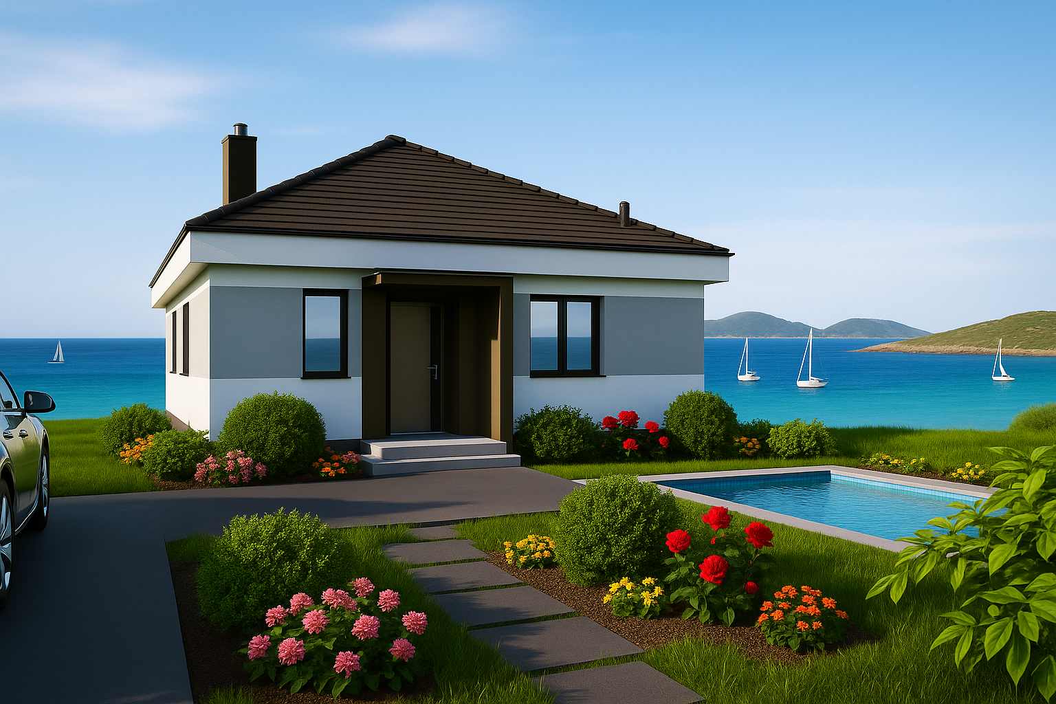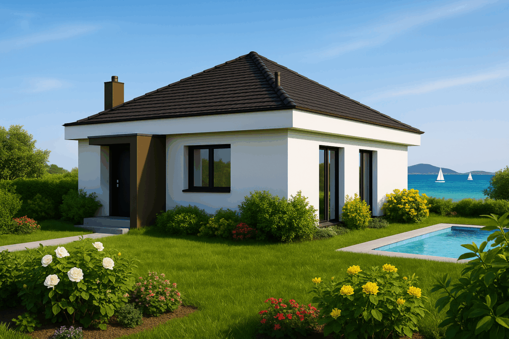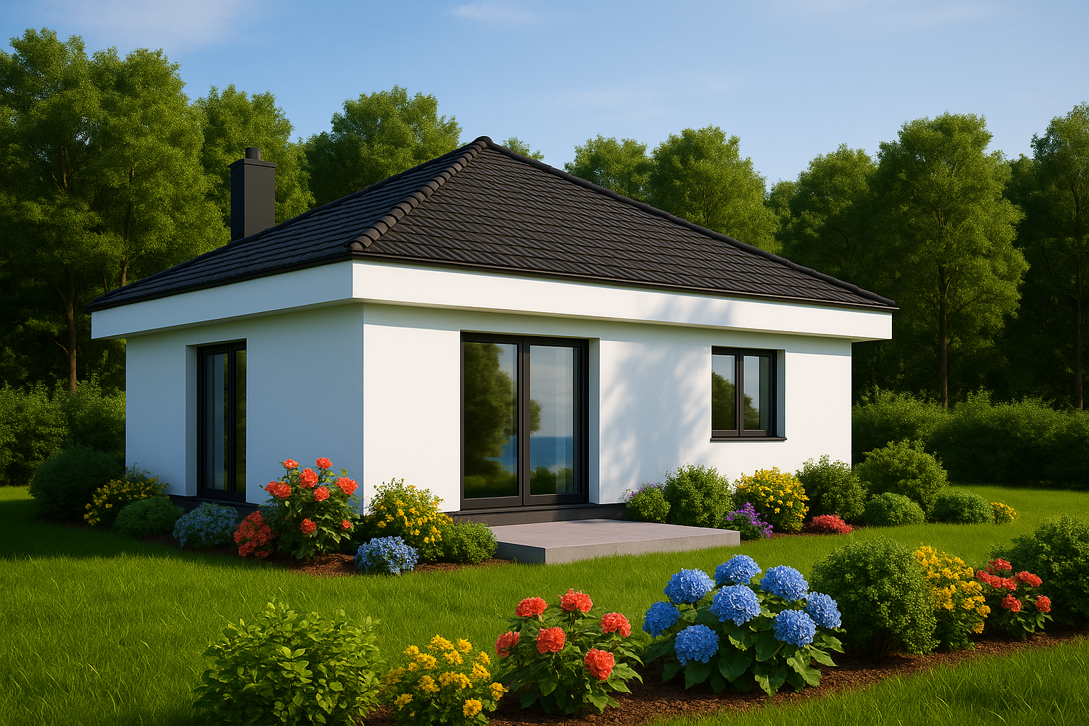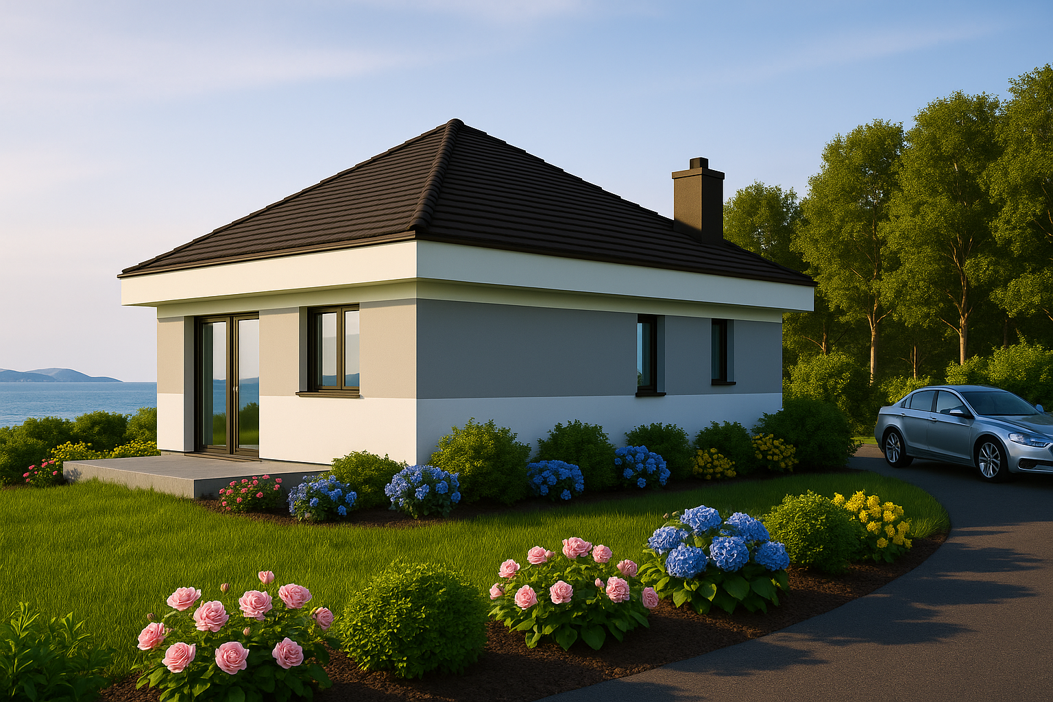 A crisp white façade, anthracite roof tiles and black aluminium windows create timeless curb appeal, while high insulation and double glazing keep energy bills down.