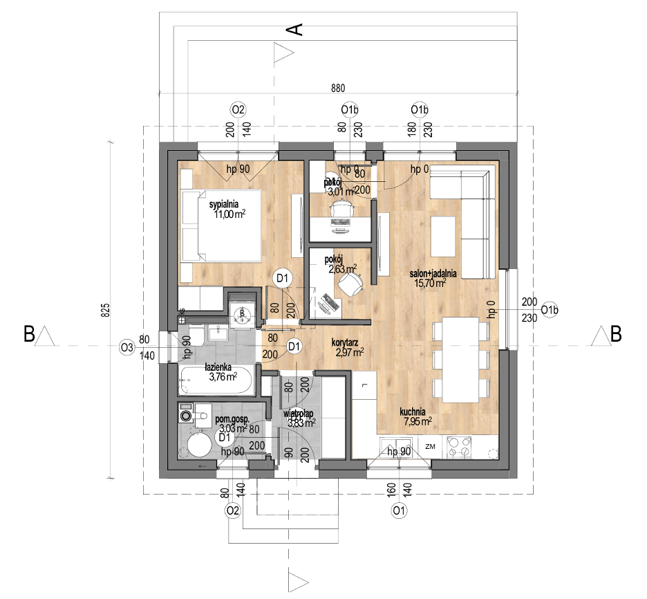 • Living + dining room: 15,70 m²