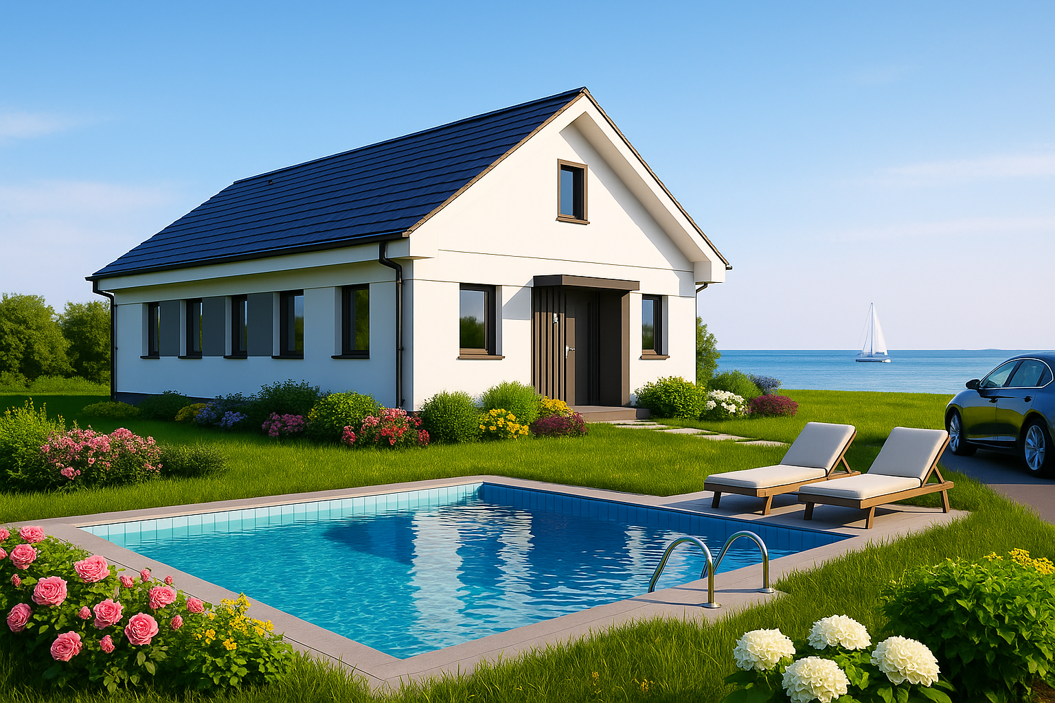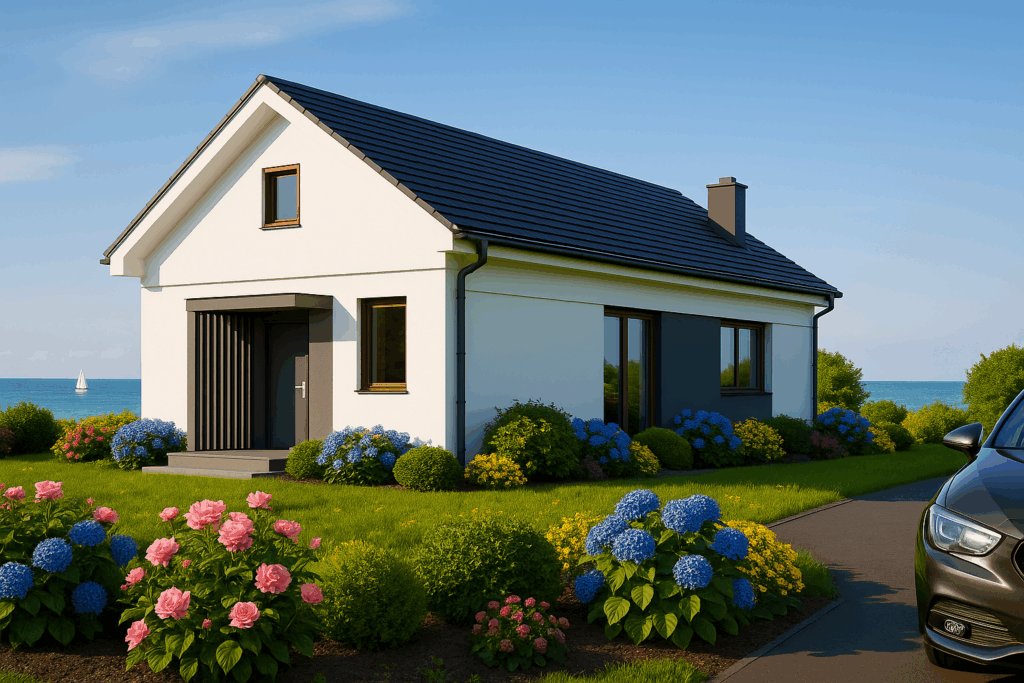 Crisp white render, a charcoal tile roof and broad sliding glass doors give modern curb appeal, while colourful hydrangeas and roses frame the lush, low‑maintenance gardens.