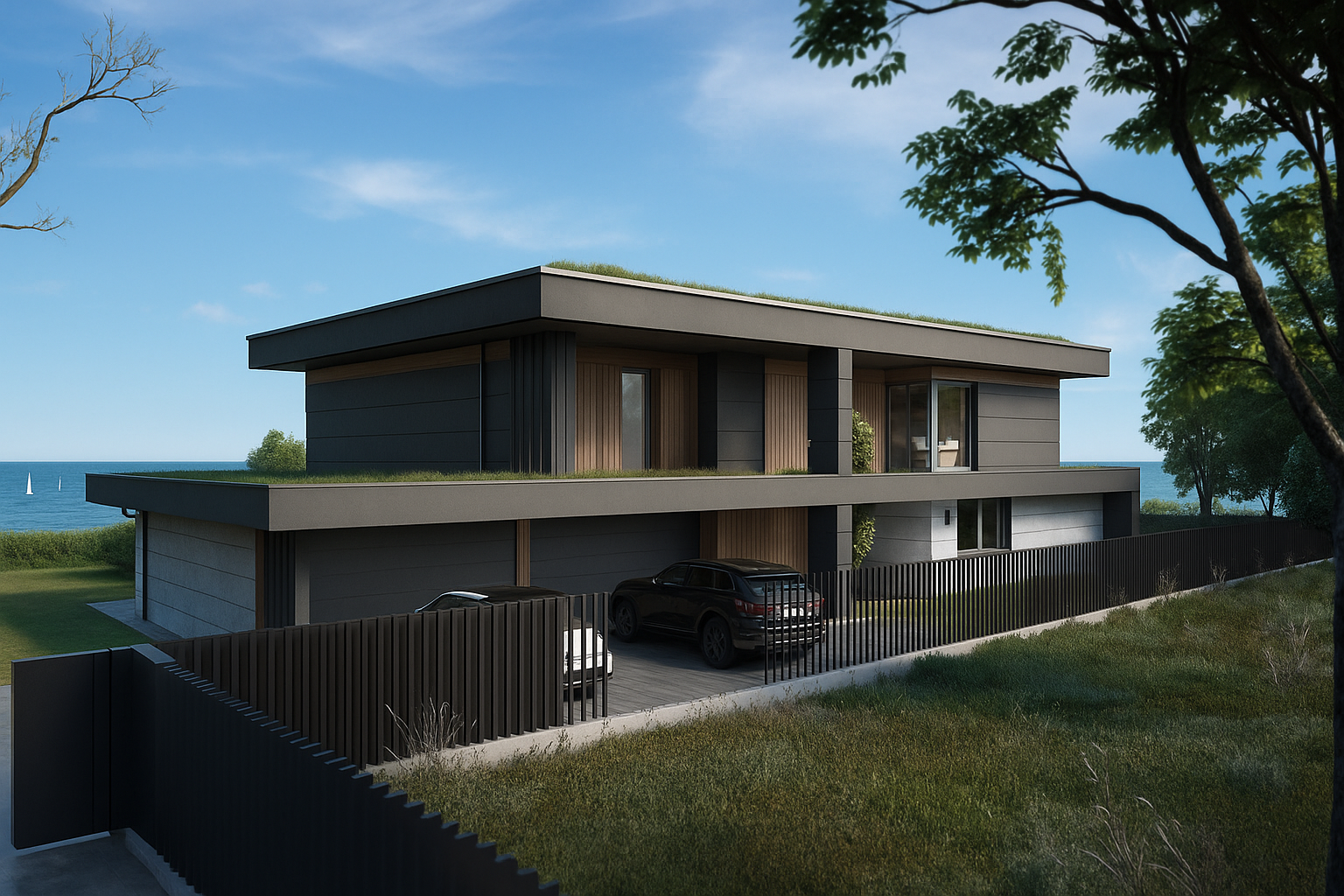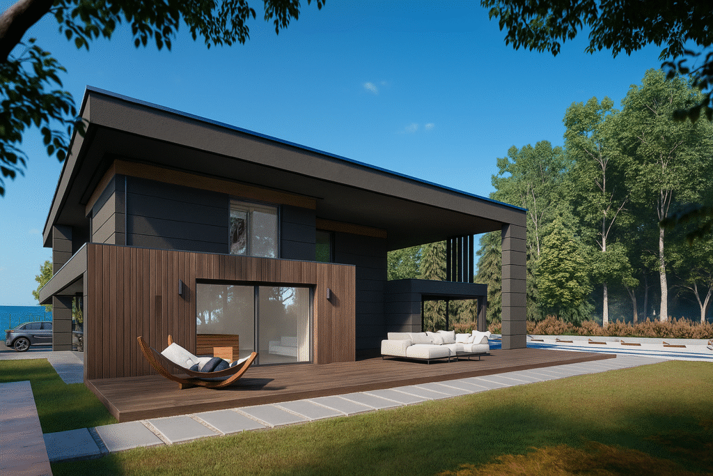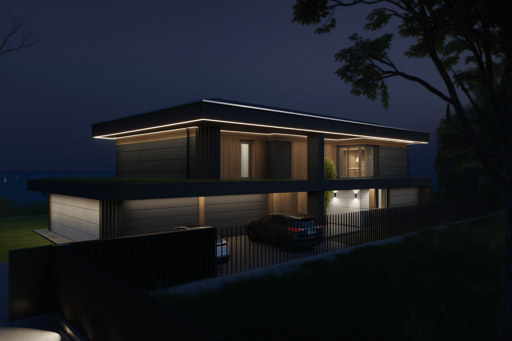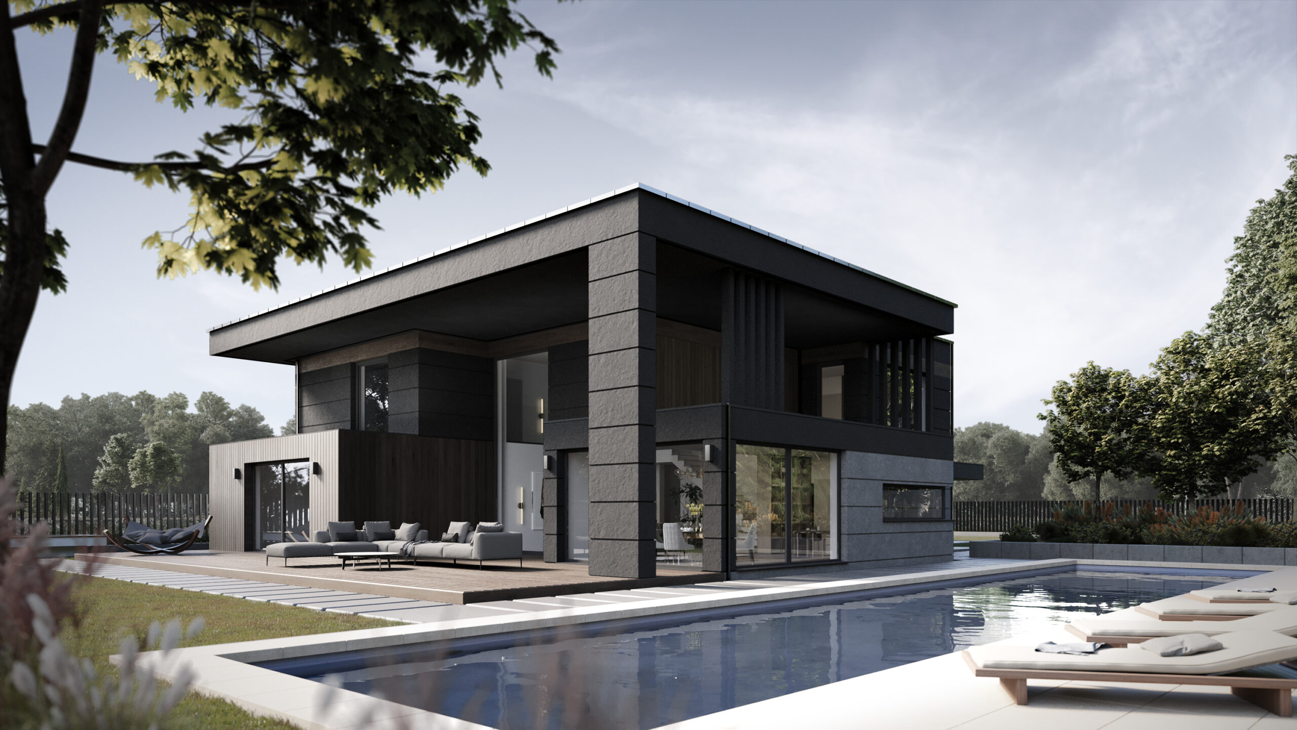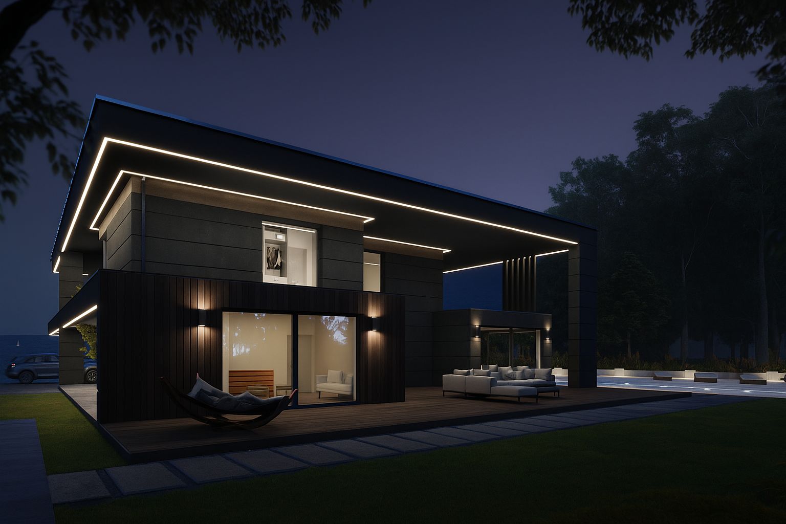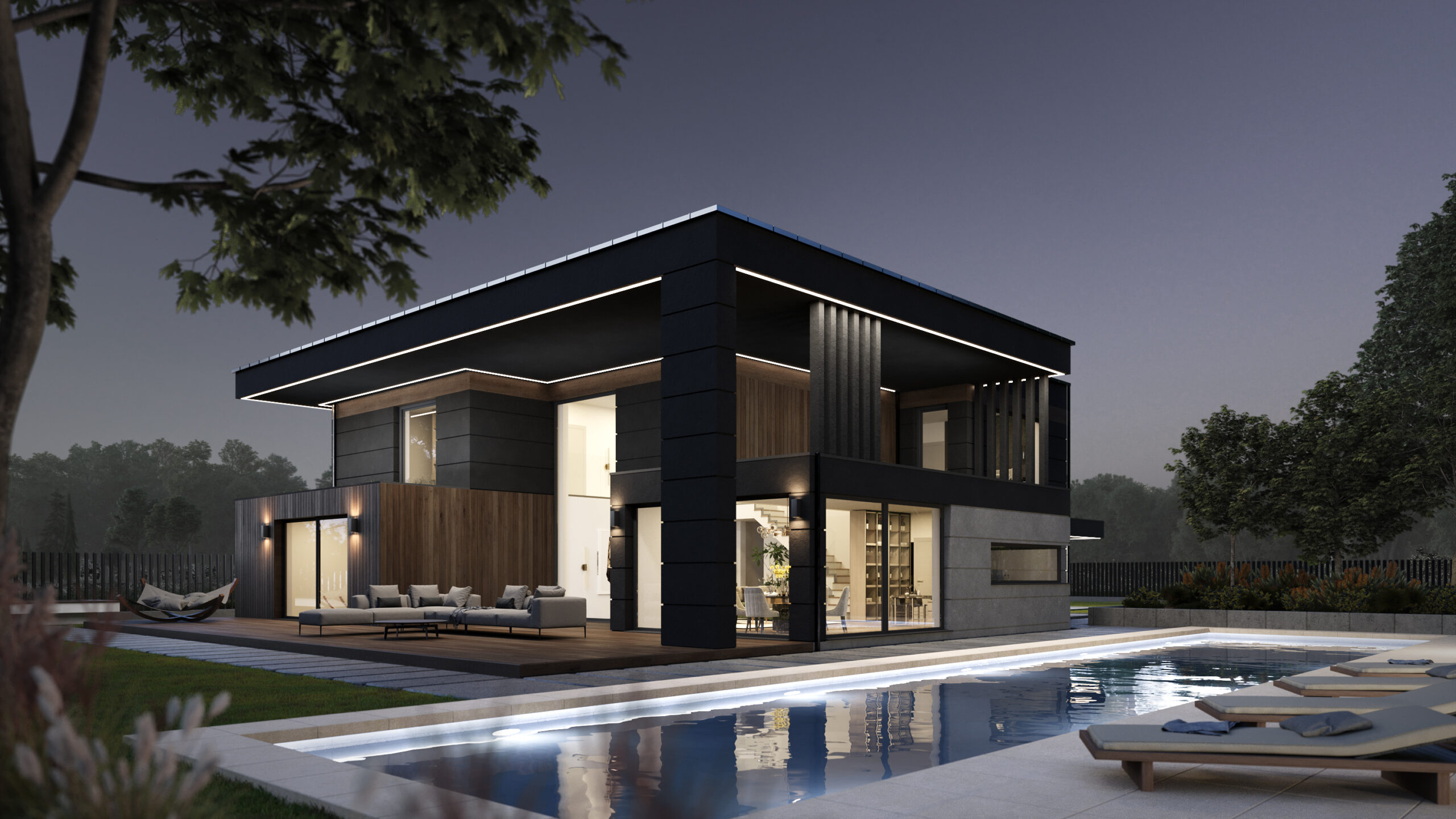 This contemporary two‑storey villa showcases a bold flat‑roof silhouette clad in dark graphite panels that stand in elegant contrast to bands of warm vertical timber. Full‑height glazing opens the interior to the landscape, while a generous pool‑side terrace flows seamlessly from the main living space and is furnished with sculptural loungers, a hammock and a cushioned outdoor seating set. A deep, cantilevered canopy frames the social zone and casts welcome shade, its soffit lined with timber that echoes the façade. After sunset, discreet wall sconces and a ribbon of LED strips tracing the roof edge bathe the building in a soft halo, highlighting its clean geometry and guiding the eye toward the water‑lit swimming pool. Mature trees and distant views of the lake lend the house a refined, resort‑like tranquillity.